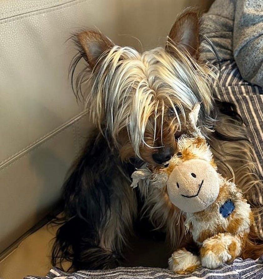 Both dogs are a little insecure in the new environment because they started exhibiting new behaviors. Cisco, who always frolics with his stuffed animals, began to hold his favorite giraffe in his mouth like a pacifier. He would suck on it and even feel asleep with it in his mouth.