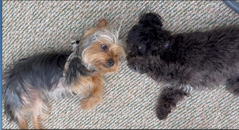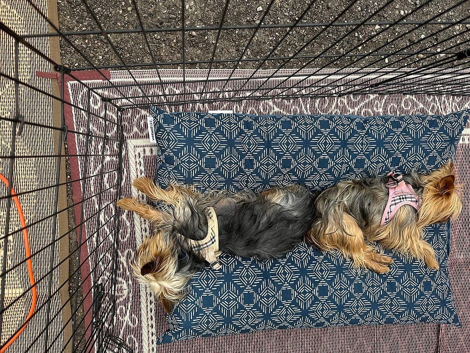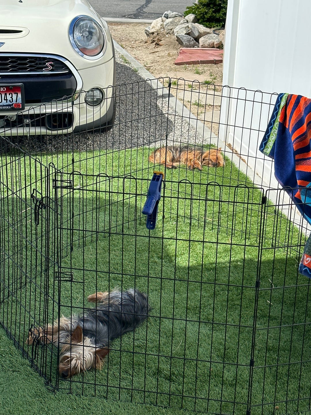 At first, until they get acclimated, they bark when another dog walks by but with the help of a squirt gun and the repeated comment, “No noise” they figured out the expectations. Eventually, they got used to the cage and enjoyed sunning in the warm air.