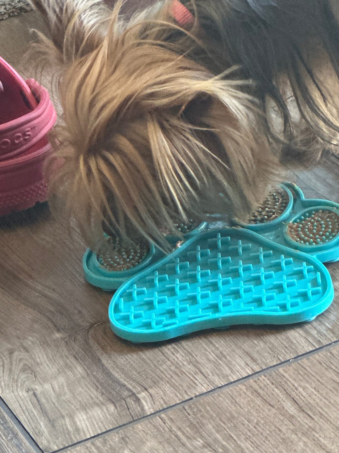 Dagney began licking more than usual. I read that dogs may lick when they are anxious, so to help her self-soothe and to stop a behavior that drove me crazy, I bought her a licking pad. She loved the peanut butter, but I am not sure it decreased her licking, just focused her energy.