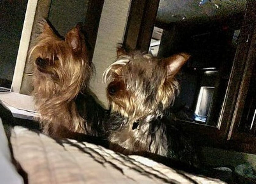 The close quarters allow for more cuddling and affection causing both dogs to get clingier when we travel. At home in the morning, the dogs use the doggy door to independently go outside to do their morning duties. In the motorhome, we wake early to take them outside. When the need is immediate, they lay on my chest, using what little patience exists due to their full bladders, and stare at me. It’s possible they are afraid they will spoil the bedding if they move too much and playing was tempting fate.