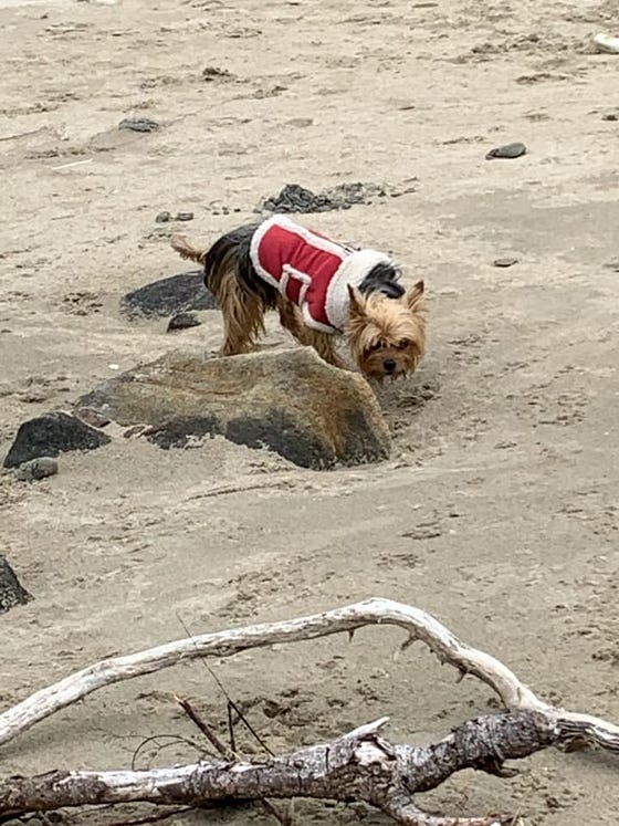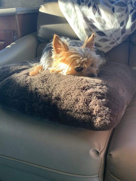Dagney displays many of the same characteristics of children but with one important difference. She is aware of her environment. Recently, we spent the night at a Harvest Host accommodation, an alpaca farm. In the morning, when she bounced out the door, she was greeted by chickens, a horse, alpacas, goats and by the looks of the holes dug in the uneven ground a lot of burrowing critters. Dagney was eager to explore the new surroundings. With her nose up in the air she took time to take in the aromas. As she walked, she lowered her nose and investigated each mound of dirt and hole that probably led to a something’s home. Not until she assured herself the area was safe did she proceed.
